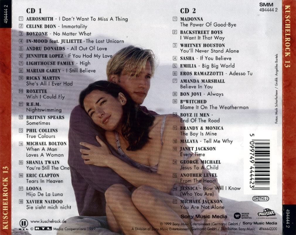 Rock 13 CD 1 01. Aerosmith - I Don't Want To Miss A Thing 02. Celine Dion - Immortality 03. Boyzone - No Matter What 04. In-Mood feat. Juliette - The Last Unicorn 05. Andru Donalds - All Out Of Love 06. Jennifer Lopez - If You Had My Love 07. Lighthouse Family - High 08. Mariah Carey - I Still Believe 09. Ricky Martin - She's All I Ever Had 10. Roxette - Wish I Could Fly 11. R.E.M. - Nightswimming 12. Britney Spears - Sometimes 13. Phil Collins - True Colours 14. Michael Bolton - When A Man Loves A Woman 15. Shania Twain - You're Still The One 16. Eric Clapton - Tears In Heaven 17. Loona - Hijo De La Luna 18. Xavier Naidoo - Sie sieht mich nicht | |