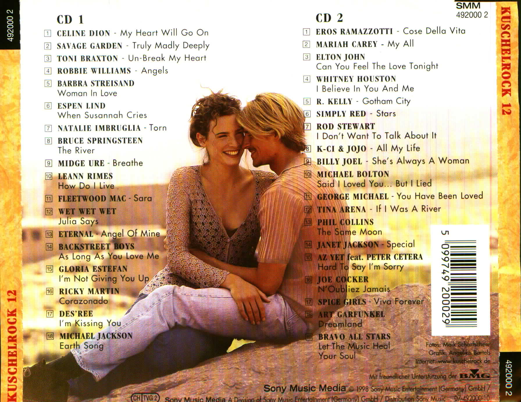 Rock 12 CD 1 01. Celine Dion - My Heart Will Go On 02. Savage Garden - Truly Madly Deeply 03. Toni Braxton - Un-Break My Heart 04. Robbie Williams - Angels 05. Barbra Streisand - Woman In Love 06. Espen Lind - When Susannah Cries 07. Natalie Imbruglia - Torn 08. Bruce Springsteen - The River 09. Midge Ure - Breathe 10. Leann Rimes - How Do I live 11. Fleetwood Mac - Sara 12. Wet Wet Wet - Julia Says 13. Eternal - Angel Of Mine 14. Backstreet Boys - As Long As You Love Me 15. Gloria Estefan - I'm Not Giving You Up 16. Ricky Martin - Corazonado 17. Des'ree - I'm Kissing You 18. Michael Jackson - Earth Song | |