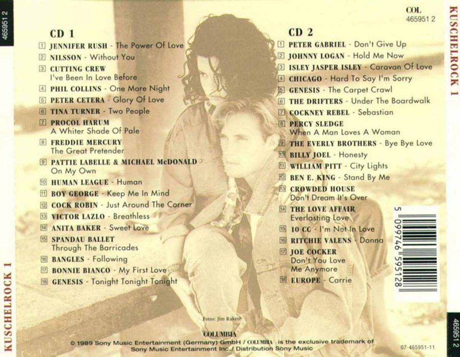 Kuschel Rock 1 CD 1 01 - Jennifer Rush - The Power Of Love 02 - Nilsson - Without You 03 - Cutting Crew - I´ve Been In love Before 04 - Phil Collins - One More Night 05 - Peter Cetera - Glory Of Love 06 - Tina Turner - Two People 07 - Procol Harum - A Whiter Shade Of Pale 08 - Freddie Mercury - The Great Pretender 09 - Pattie Labelle & Michael McDonald - On My Own 10 - Human League - Human 11 - Boy George - Keep Me In Mind 12 - Cock Robin - Just Around The Corner 13 - Victor Lazlo - Breathless 14 - Anita Baker - Sweet Love 15 - Spandau Ballet - Through The Barricades 16 - Bangels - Following 17 - Bonnie Bianco - My First Love 18 - Genesis - Tonight Tonight Tonight | |