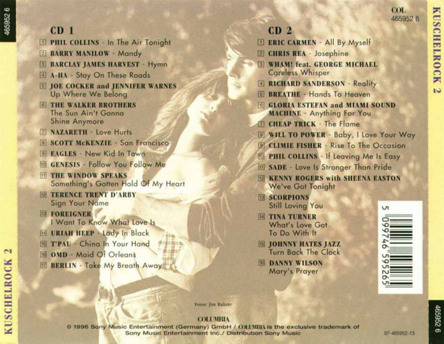 Kuschel Rock 2 CD 1 01 - Phil Collins - In The Air Tonight 02 - Barry Manilow - Mandy 03 - Barclay James Harvest - Hymn 04 - A-HA - Stay On These Roads 05 - Joe Cocker and Jennifer Warnes - Up Where We Belong 06 - The Walker Brothers - The Sun Ain´t Gonna Shine Anymore 07 - Nazareth - Love Hurts 08 - Scott McKenzie - San Francisco 09 - Eagles - New Kid In Town 10 - Genesis - Follow You Follow Me 11 - The Window Speaks - Something´s Gotten Hold Of My Heart 12 - Terence Trent D´Arby - Sign Your Name 13 - Foreigner - I Want To Know What Love Is 14 - Uriah Heep - Lady In Black 15 - T´Pau - China In Your Hand 16 - OMD - Maid Of Orleans 17 - Berlin - Take My Breath Away | |