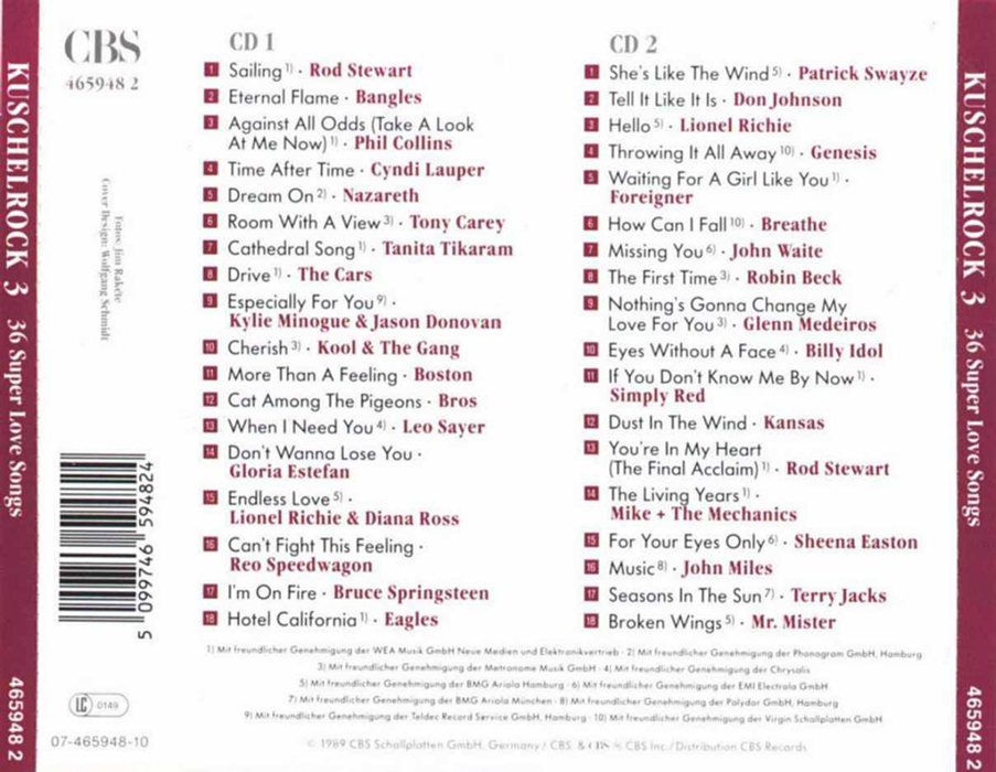 Kuschel Rock 3 CD 1 01 - Rod Stewart - Sailing 02 - Bangels - Eternal Flame 03 - Phil Collins - Against All Odds (Take A look At Me Now) 04 - Cyndi Lauper - Time After Time 05 - Nazareth - Dream On 06 - Tony Carey - Room With A View 07 - Tanita Tikaram - Cathedral Song 08 - The Cars - Drive 09 - Kylie Minogue & Jason Donovan - Especially For You 10 - Kool & The Gang - Cherish 11 - Boston - More Than A Feeling 12 - Bros - Cat Among The Pigeons 13 - Leo Sayer - When I Need You 14 - Gloria Estefan - Don´t Wanna Lose You 15 - Lionel Richie & Diana Ross - Endless Love 16 - Reo Speedwagon - Can´t Fight This Feeling 17 - Bruce Springsteen - I´m On Fire 18 - Eagles - Hotel California | |