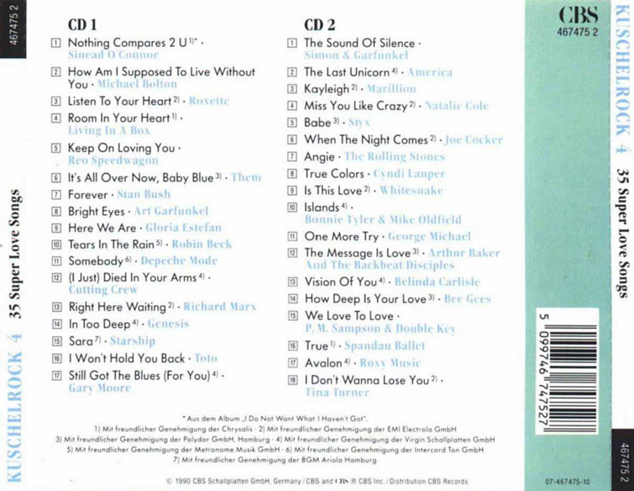 Kuschel Rock 4 CD 1 01 - Sinead O´Connor - Nothing Compares 2 U 02 - Michael Bolton - How Am I Supposed To Live Without You 03 - Roxette - Listen To Your Heart 04 - Living In A Box - Room In Your Heart 05 - Reo Speedwagon - Keep On Loving You 06 - Them - It´s All Over Now, Baby Blue 07 - Stan Bush - Forever 08 - Art Garfunkel - Bright Eyes 09 - Gloria Estefan - Here We Are 10 - Robin Beck - Tears In The Rain 11 - Depeche Mode - Somebody 12 - Cutting Crew - (I Just) Died In Your Arms 13 - Richard Marx - Right Here Waiting 14 - Genesis - In Too Deep 15 - Starship - Sara 16 - Toto - I Wan´t Hold You Back 17 - Gary Moore - Still Got The Blues (For You) | |