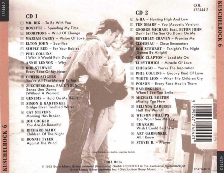 Kuschel Rock 6 CD 1 01 - Mr. Big - To Be With You 02 - Roxette - Spending My Time 03 - Scorpions - Wind Of Change 04 - Mariah Carey - Vision Of Love 05 - Elton John - Sacrifice 06 - Simply Red - For Your Babies 07 - Phil Collins - I Wish It Would Rain Down 08 - Annie Lennox - Why 09 - Rod Stewart - Every Beat Of My Heart 10 - Curtis Stigers - You´re All That Matters To Me 11 - Zucchero ft. Paul Young - Senza Una Donna 12 - Genesis - Hold On My Heart 13 - Simon & Garfunkel - Bridge Over Troubled Water 14 - Cat Stevens - Morning Has Broken 15 - Joe Cocker - You Are So Beautiful 16 - Richard Marx - Children Of The Night 17 - Bonnie Tyler - Against The Wind |