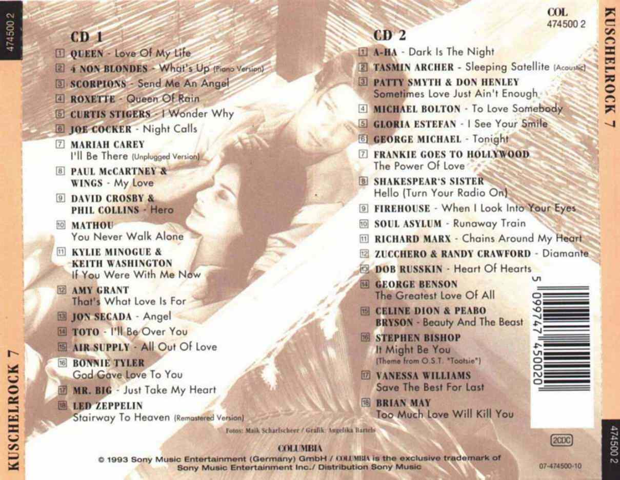 Kuschel Rock 7 CD 1 01 - Queen - Love Of My Life 02 - 4 Non Blondes - What´s Up 03 - Scorpions - Send Me An Angel 04 - Roxette - Queen Of Rain 05 - Curtis Stigers - I Wonder Why 06 - Joe Cocker - Night Calls 07 - Mariah Carey - I´ll Be There 08 - Paul McCartney & Wings - My Love 09 - David Crosby & Phil Collins - Hero 10 - Mathou - You Never Walk Alone 11 - Kylie Minogue & Keith Washington - If You Were With Me Now 12 - Amy Grant - That´s What Love Is For 13 - Jon Secada - Angel 14 - Toto - I´ll Be Over You 15 - Air Supply - All Out Of Love 16 - Bonnie Tyler - Got Gave Love To You 17 - Mr. Big - Just Take My Heart 18 - Led Zeppelin - Stairway To Heaven |