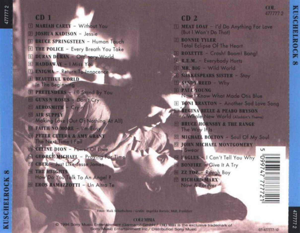 Kuschel Rock 8 CD 1 01 - Mariah Carey - Without You 02 - Joshua Kadison - Jessie 03 - Bruce Springsteen - Human Touch 04 - The Police - Every Breath You Take 05 - Duran Duran - Ordinary World 06 - Haddaway - I Miss You 07 - Enigma - Return To Innocence 08 - Beautiful World - In The Beginning 09 - Pretenders - I´ll Stand By You 10 - Guns N´Roses - Don´t Cry 11 - Aerosmith - Cryin´ 12 - Air Supply - Making Love (Out Of Nothing At All) 13 - Fait No More - I´m Easy 14 - Peter Cetera & Amy Grant - The Next Time I Fall 15 - Celine Dion - Power Of Love 16 - George Michael - Praying For Time 17 - Cher - Just Like Jesse James 18 - The Heights - How Do You Talk To An Angel 19 - Eros Ramazzotti - Un Altra Te |