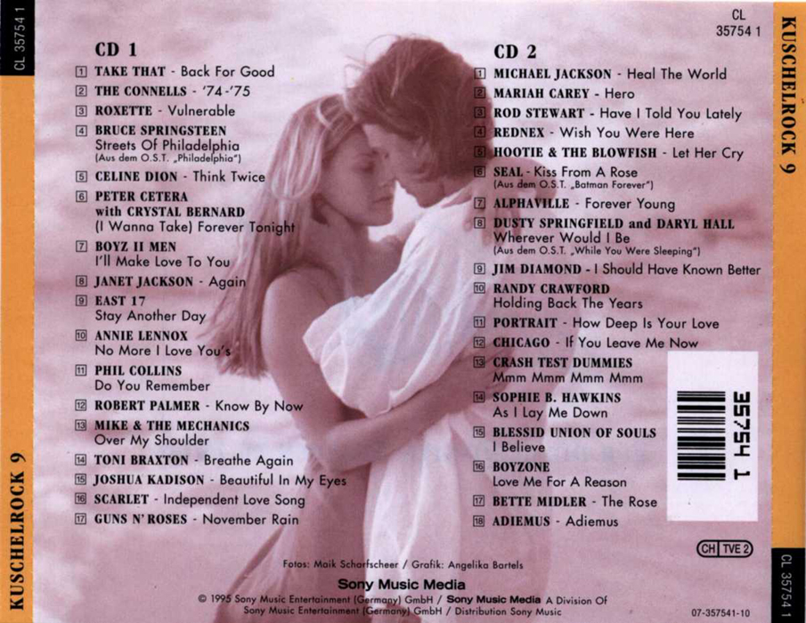 9 CD 1 01 - Take That - Back For Good 02 - The Connels - ´74 -´75 03 - Roxette - Vulnerable 04 - Bruce Springsteen - Streets Of Philadelhia 05 - Celine Dion - Think Twice 06 - Peter Cetera with Crystal Bernhard - (I Wanna Take) Forever Tonight 07 - Boyz II Men - I´ll Make Love To You 08 - Janet Jackson - Again 09 - East 17 - Stay Another Day 10 - Annie Lennox - No More I Love You´s 11 - Phil Collins - Do You Remember 12 - Robert Palmer - Know By Now 13 - Mike + The Mechanics - Over My Shoulder 14 - Toni Braxton - Breathe Again 15 - Joshua Kadison - Beautiful In My Eyes 16 - Scarlet - Independent Love Song 17 - Guns N´Roses - November Rain |
