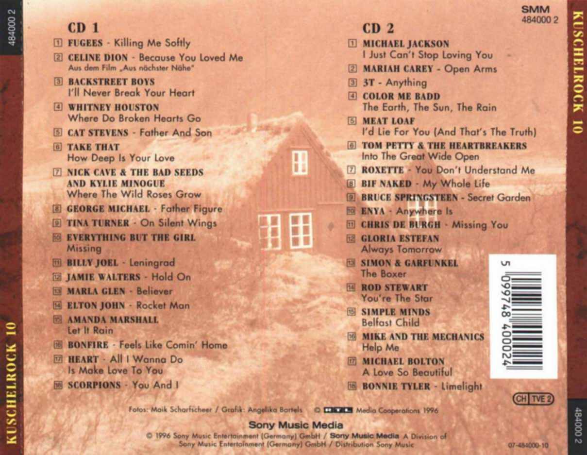 10 CD 1 01 - Fugees - Killing Me Softly 02 - Celine Dion - Because You Loved Me 03 - Backstreet Boys - I´ll Never Break Your Heart 04 - Whitney Houston - Where Do Broken Hearts Go 05 - Cat Stevens - Father And Son 06 - Take That - How Deep Is Your Love 07 - Nick Cave & The Bad Seeds and Kylie Minogue - Where The Wild Roses Grow 08 - George Michael - Father Figure 09 - Tina Turner - On Silent Wings 10 - Everything But The Girl - Missing 11 - Billy Joel - Leningrad 12 - Jamie Walters - Hold On 13 - Maria Glen - Believer 14 - Elton John - Rocket Man 15 - Amanda Marshall - Let It Rain 16 - Bonfire - Feels Like Comin´ Home 17 - Heart - All I Wanna Do Is Make Love To You 18 - Scorpions - You And I |