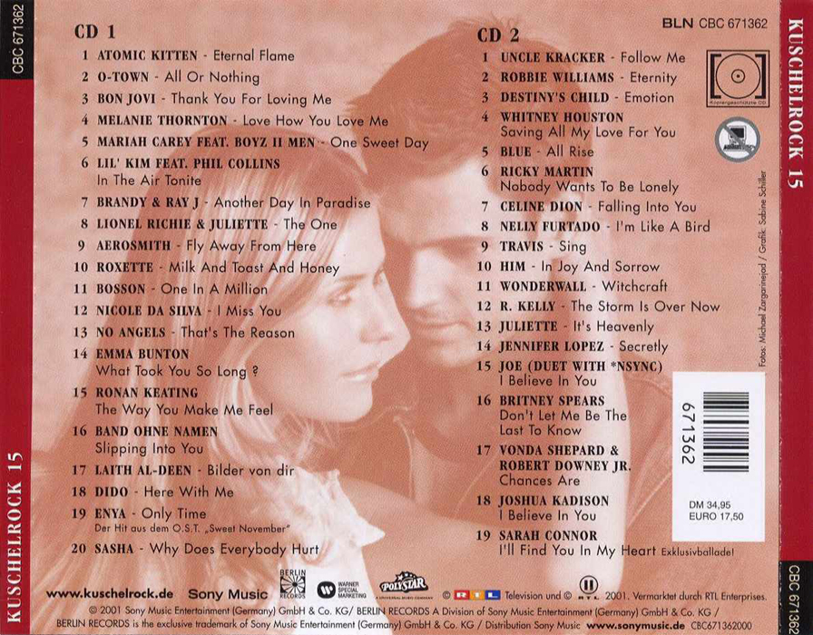Rock 15 CD 1 01. Atomic Kitten - Eternal Flame 02. O-Town - All Or Nothing 03. Bon Jovi - Thank You For Loving Me 04. Melanie Thornton - Love How You Love Me 05. Mariah Carey & Boyz II Men - One Sweet Day 06. Lil' Kim feat. Phil Collins - In The Air Tonite 07. Brandy & Ray J - Another Day In Paradise 08. Lionel Richie & Juliette - The One 09. Aerosmith - Fly Away From Here 10. Roxette - Milk And Toast And Honey 11. Bosson - One In A Million 12. Nicole Da Silva - I Miss You 13. No Angels - That's The Reason 14. Emma Bunton - What Took You So Long? 15. Ronan Keating - The Way You Make Me Feel 16. Band Ohne Namen - Slipping Into You 17. Laith Al-Deen - Bilder Von Dir 18. Dido - Here With Me 19. Enya - Only Time 20. Sasha - Why Does Everybody Hurt | |