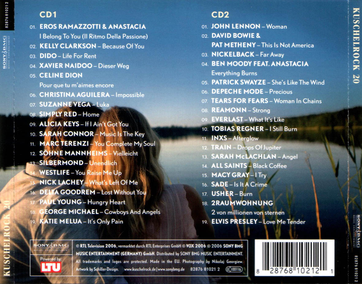 Rock 20 CD 1 01 Eros Ramazzotti and Anastacia – I Belong to You(Il Ritmo Dell) 02 Kelly Clarkson – Because of You 03 Dido – Life for Rent 04 Xavier Naidoo – Dieser Weg (Radio Edit) 05 Celine Dion – Pour Que Tu M Aimes Encore (Album Version) 06 Christina Aguilera – Impossible 07 Suzanne Vega – Luka 08 Simply Red – Home 09 Alicia Keys – If I Aint Got You 10 Sarah Connor – Music is the Key (Video Version) 11 Marc Terenzi – You Complete My Soul 12 Soehne Mannheims – Vielleicht (Radio Edit) 13 Silbermond – Unendlich (Radio Version) 14 Westlife – You Raise Me Up 15 Nick Lachey – Whats Left of Me (Main Version) 16 Delta Goodrem – Lost Without You 17 Paul Young – Hungry Heart 18 George Michael – Cowboys and Angels (Album Version) 19 Katie Melua – Its Only Pain | |